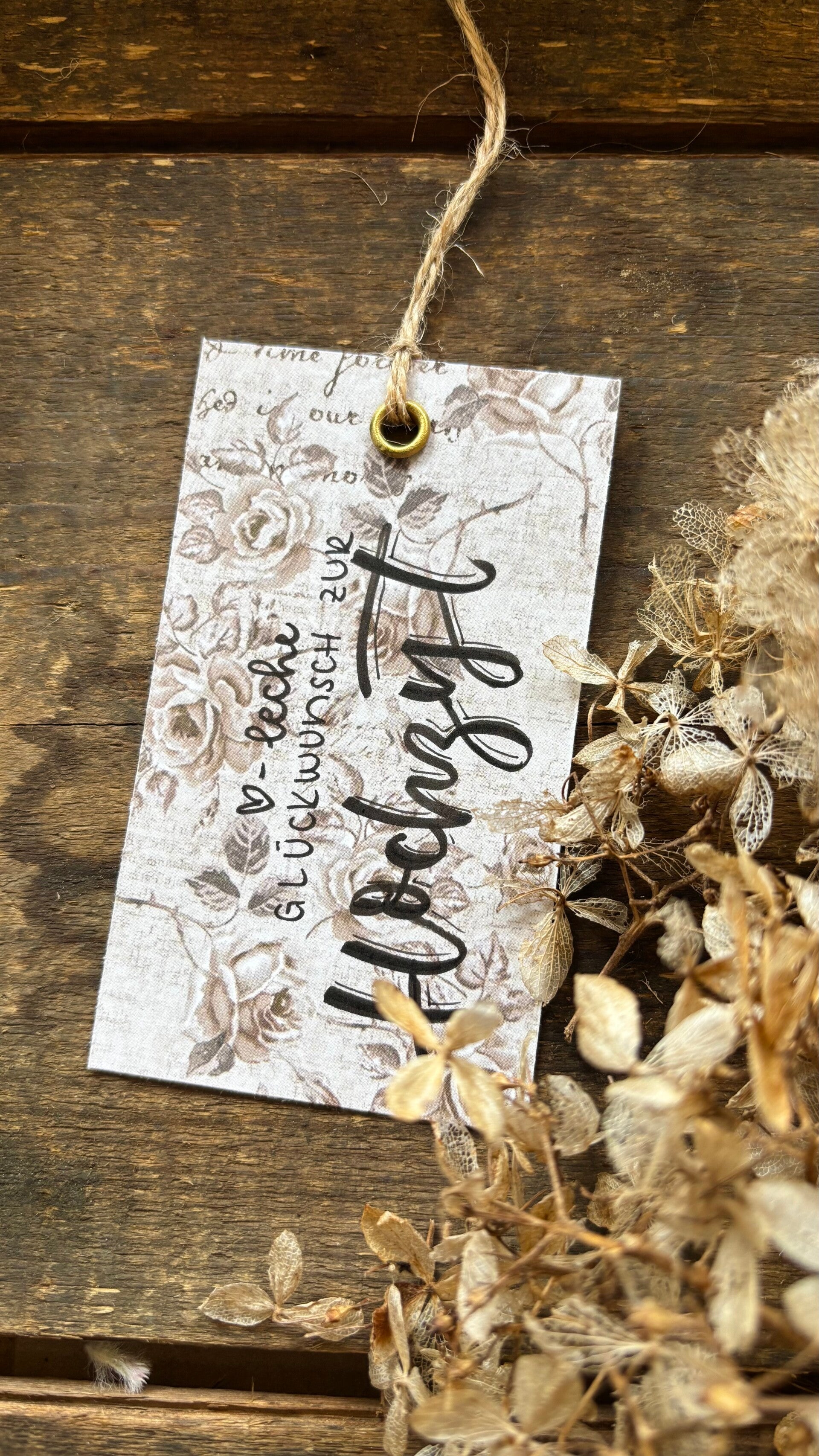 Die Gschänksahängerli wärde aui vo Hang usgschnitte, mitere Öse u Schnüerli verziert u när vo Hang beschriftet.