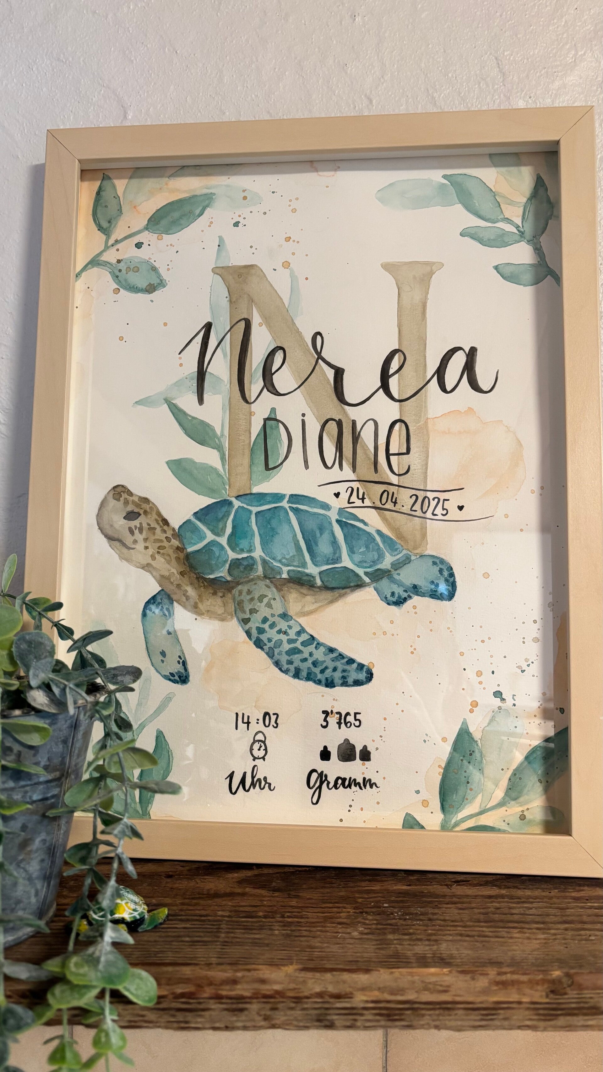 E einzigartegi Gschänksidee zure Geburt, Toufi oder süsch ame Ahlass. Das Biud wird mit viu Liebi u Härzbluet vo Hang houptsächlech mit Wasserfarbe ersteut u auefaus mau mitemne Fineliner Stift Konture nachezeichnet. Somit isch u blibt jedes Biud es Unikat.